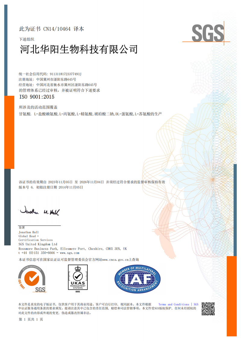 河北華陽集團坐落于河北省衡水市冀州區(qū)省級工業(yè)園區(qū)(始建于1987年,前身為冀州市華陽化工有限責(zé)任公司)。集團下屬四個公司:河北華陽生物科技有限公司、河北華悅氨基酸科技有限公司、滄州華晨生物科技有限公司、衡水市陽力商貿(mào)有限公司。主要生產(chǎn)甘氨酸、L-丙氨酸、L-蘇氨酸、DL-蛋氨酸、L-賴氨酸鹽酸鹽、L-半胱氨酸鹽酸鹽、干貝素等氨基酸系列食品級產(chǎn)品,廣泛應(yīng)用于食品、飲料、飼料等行業(yè)。......
